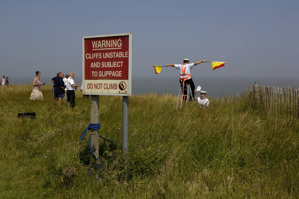 If Ever You’re In The Area was a multi-faceted and collaborative project, held at coastal locations and art venues in the East of England during 2005 and 2006. This body of work responded to the physical and historical qualities of these isolated edge-lands, shaped by global events such as (fear of) war-time invasion and the effects of rising sea levels .  If Ever You’re In The Area involved a solo show from 10 June to 6 July 2006 at the Naze Tower in Walton-on-the-Naze, Essex, (first shown at firstsite in 2005) with a focus on a live event day on 1st July 2006, when local Sea Cadets performed Lines of Approach.