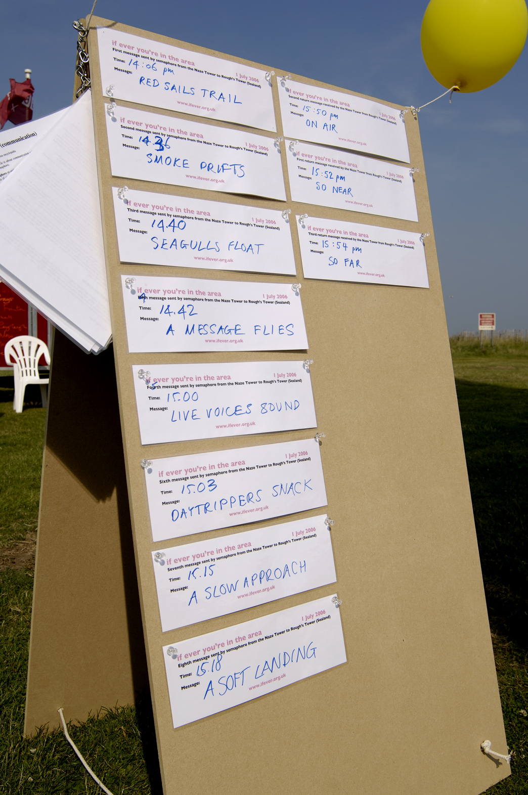 The coastal sites used are places resonating with meaning: where military structures of watchtowers and bunkers remain; erosion of the coastline reveals natural invasion; and local communities hold on to memories of former conflicts. Lines of Defence, sited at Bawdsey in Suffolk, is one such example and central to the body of work. Here individually lettered flags were positioned on the land’s edge, disappearing to visually record the seventeen metres worn away over eight months.The progress of Lines of Defence, along with other works, was tracked during 2005 on the If Ever You’re in the Area website: a platform to access and engage with the project as a whole. As Furnée’s flags were lost to the sea, their finders were asked to send her a message of discovery. This element of unexpected, but welcomed, participation has existed throughout the project. An active, even performative quality is evident too. From an invitation to place pebbles in and around a constructed cenotaph at firstsite, conversations held over tea, to the signalling by individuals at the Naze Tower across the sea to others in the Principality of Sealand, If Ever You’re in the Area has constantly involved as it evolved. More significantly, such direct perspectives have not only fed into the work but also seem to have validated it.