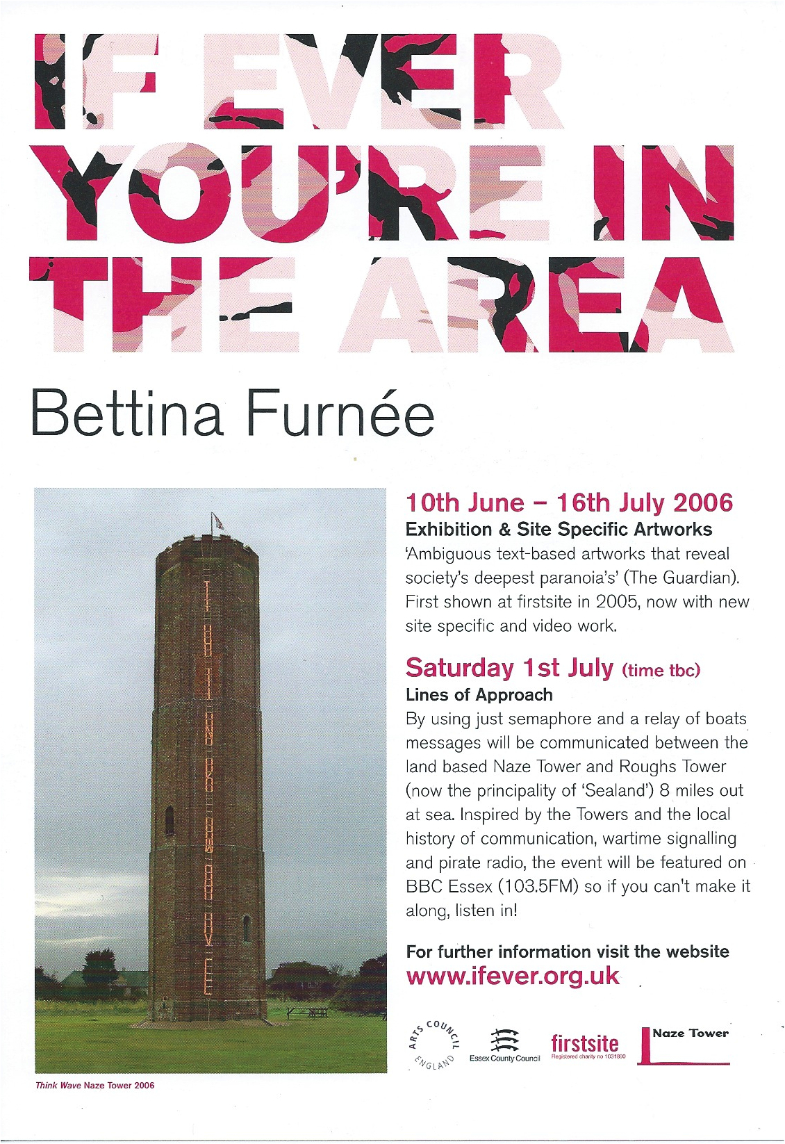 Over an intense two-year period, Bettina Furnée has produced a significant body of work under the title If Ever You’re in the Area: an exploration of war, migration, identity and fearing attack. It began with an exhibition at firstsite, Colchester (18 June – 23 July 2005), an occasion that marked a physical movement for Furnée’s work, from external locations to a traditional – and indoor – context. Site specific interventions are another feature of the project. Developed along the East coast, they have incorporated chosen audiences and places. In the final phase these two aspects come together, with pieces being sited inside and outside for an exhibition at the Naze Tower, Walton-on-the-Naze (10 June – 16 July 2006).